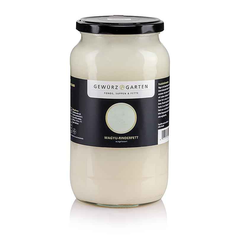 Ausgelassenes Fett vom bayrischen Wagyu-Rind. Zutaten: Fett vom Wagyu-Rind. Kühl bei +3°C bis +7°C lagern.