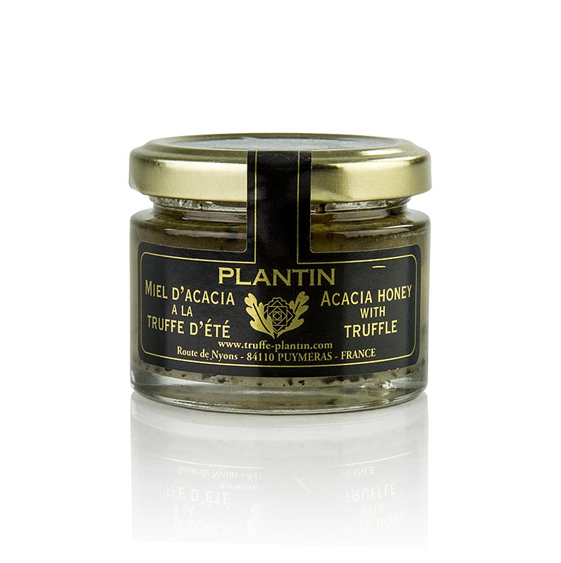 Honigzubereitung. Zutaten: 94,6% Akazienhonig, 5% schwarze Sommertrüffelstücke (Tuber Aestivum), 0,4% Trüffelaroma.