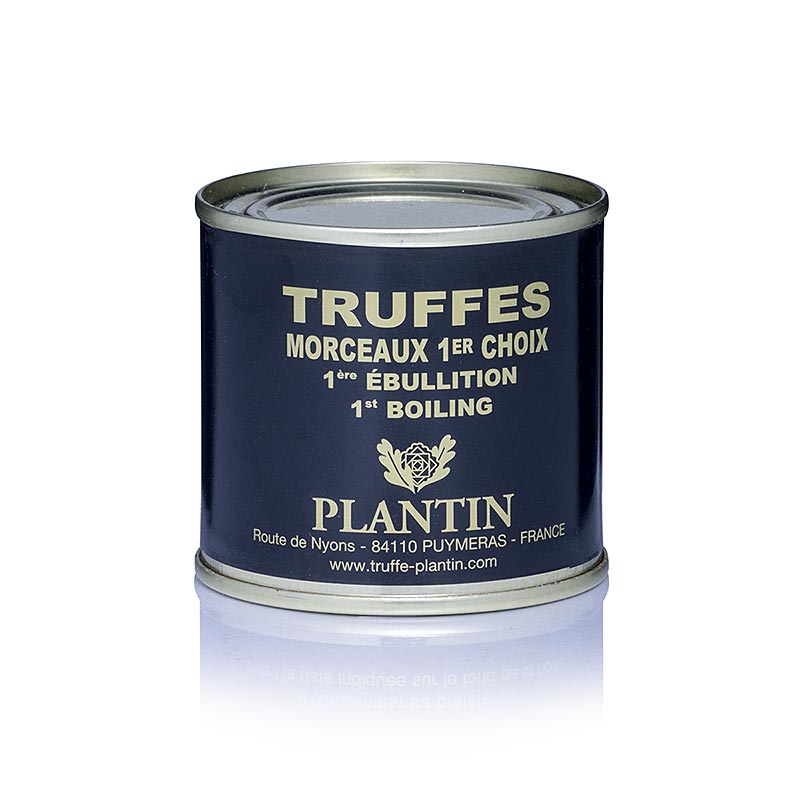 Kleine und große Stücke von geschälten und gebürsteten Wintertrüffeln. Mit Trüffelsaft und Salz eingekocht. Vollkonserve. Wie frische Trüffel zu verwenden. In kleine Würfel schneiden und für Saucen mit etwas Olivenöl andünsten. Gut zur Herstellung von Terrinen, Pasteten, an Saucen oder zu Frischkäse. Abtropfgewicht: 50g
