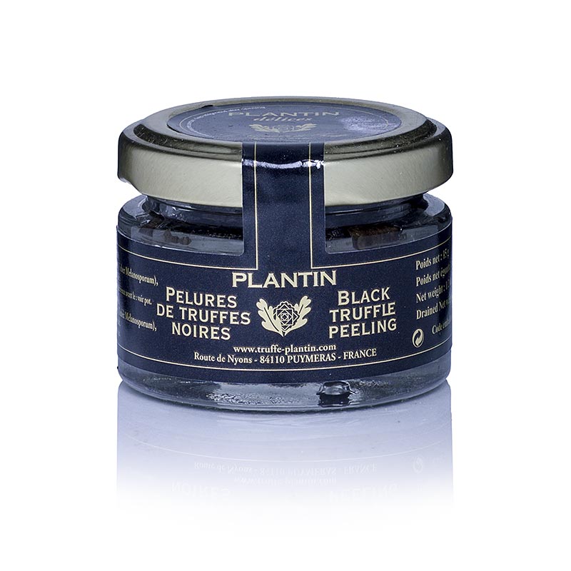 Schalen vom Winter-Edeltrüffel in Salz und Trüffelsaft eingekocht. Vollkonserve. Sie können zum Aromatisieren von Saucen angewendet werden; dabei sollte man sie vorher in etwas Olivenöl andünsten. Abtropfgewicht: 12g