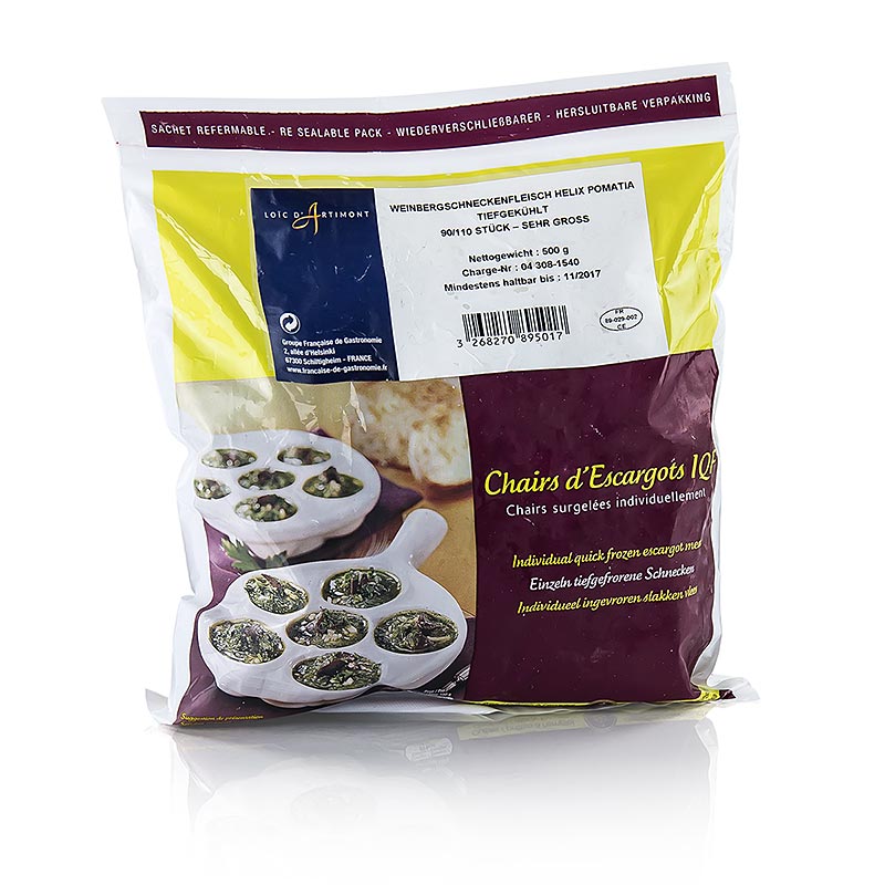 Vorgekochtes Schneckenfleisch (Helix Pomatia), einzeln tiefgefroren. Zutaten: gekochtes SCHNECKENfleisch (Helix Pomatia), Salz, Gewürze, Gewürzpflanzen (enthält SELLERIE). Zubereitung: Nehmen Sie die gewünschte Anzahl von Schnecken aus dem Beutel und legen Sie den Beutel sofort danach wieder in die Tiefkühltruhe. Tauen Sie die Schnecken einige Sekunden im Mikrowellenherd oder in einer Brühe auf. Verwenden Sie die Schnecken wie gewünscht, mit Kräuterbutter, für Kasseröllchen oder Spießchen. Lagerung: * 24 Stunden im Kühlschrank. ** 3 Tage im Tiefkühlschrank. *** Mehrere Monate bei mindestens -18°C Nach den Auftauen nicht wieder einfrieren. Produkt aus Frankreich.