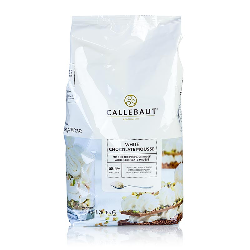 Mischung für weiße Schokoladenmousse. Zutaten: 58,5% weiße Schokolade (Zucker, VollMILCHpulver, Kakaobutter, MagerMILCHpulver, Emulgator: SOJAlecithin, natürliches Vanillearoma), MagerMILCHpulver, Zucker, ganz gehärtete pflanzliche Fette (Palmkern), MILCHEIweiß, Emulgator: E471, E472a, Stabilisator: E340ii, Farbstoff: E160a. Dosierung: 800 g/ 1 Liter Milch. Zubereitung: 800g Pulver mit einem Liter Milch, mit hoher Geschwindigkeit, aufschlagen, in Dessertschalen oder Gläser portionieren und im Kühlschrank vor dem Servieren 2 Stunden abkühlen lassen. Zubereitetes Produkt kann bei -18°C tiefgefroren werden. Kühl, trocken und geruchsfrei lagern. Produkt aus Belgien. Eigenschaften: Eiweiß aus tierischer Milch.