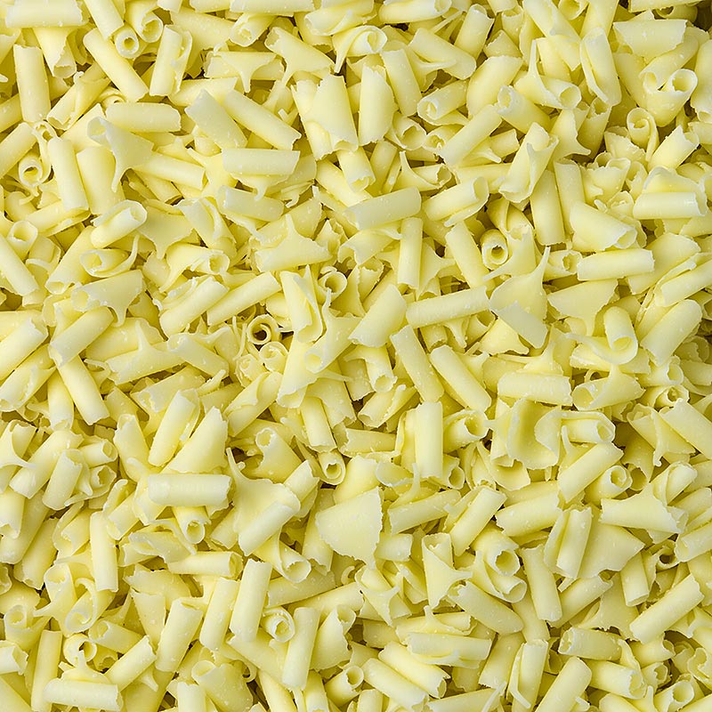 Fein geraspelte weiße Schokolade feinster Qualität zum Garnieren und Verzieren von Kuchen, Gebäck, Eis oder Desserts.