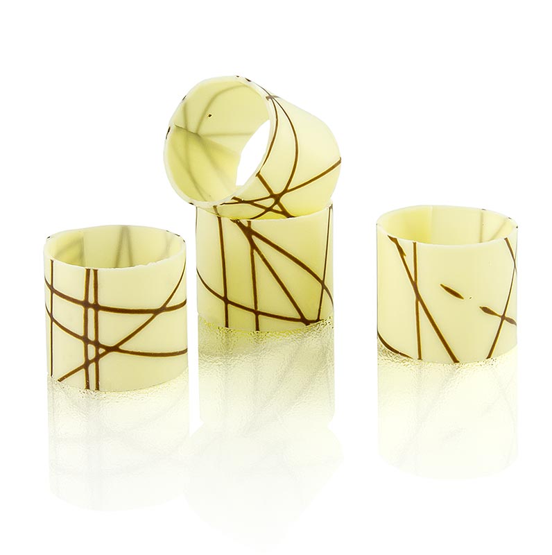 Diese weiße Schokoform-Cannelloni, mit dunklen Streifen, können zum Befüllen mit Cremes, Mousse oder anderen Massen sowie als dekorativer Aufleger eingesetzt werden.