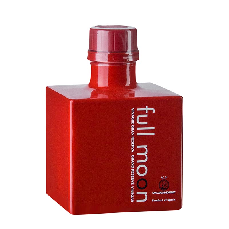 "Full Moon" San Carlos Gran Reserva Balsamico wird aus handverlesenen Pedro Ximenez Trauben hergestellt. Er reift 12 Jahre in amerikanischen Eichenholzfässern, gemäß des Criadera und Solera Verfahrens. Mit seinem fruchtig-kräftigen Geschmack ist er ein idealer Begleiter zu Fischgerichten, wie Schwertfisch-Carpaccio, Lachs oder Tintenfisch. Empfehlenswert auch zu Ente und Obstsalat oder zum Marinieren von Fleisch.