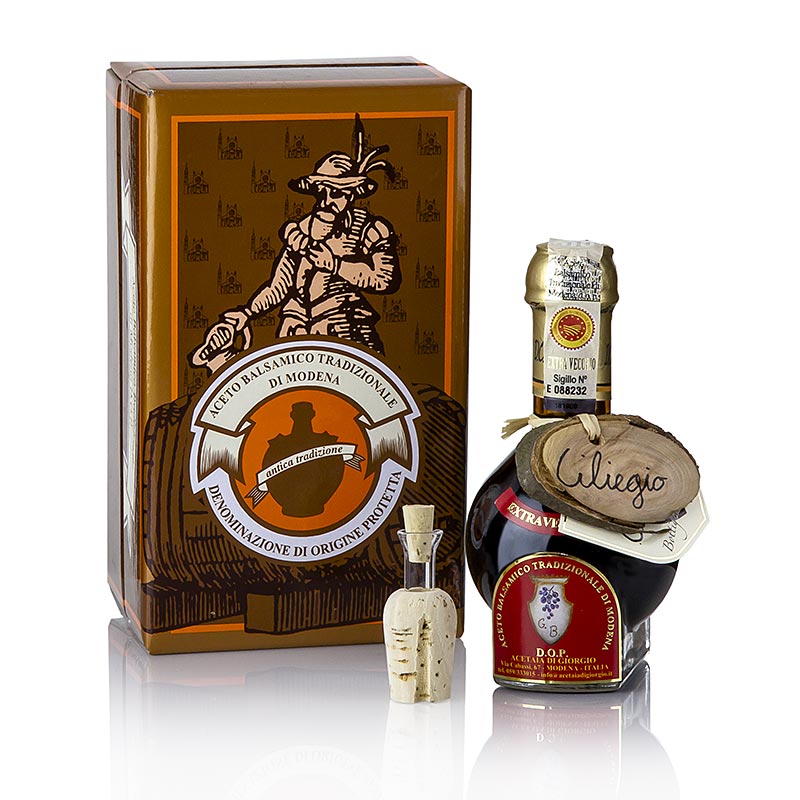 Die Tradition der Balsamicos war und ist in der Familie Giorgio ein Lebensstil, wie ein Gen, das von Generation zu Generation übertragen wird und erhält in den Fässer den Charme und Verführung der alten Riten. Nach Jahrhunderten alter Tradition und mit viel Zeit wird aus dem Traubenmost eine schwarze und sämige Köstlichkeit voll von unverwechselbaren Aromen. Freigegeben wird der Aceto Balsamico frühestens nach 12 Jahren Reifung, in verschiedenen Holzfässern. Nach 25 Jahren hat er das Aroma von dunklen Wildkischen und passt hervorragend zu Panna Cotta, Erdbeeren und Vanille-Eis oder als fruchtiger Digestiv. Vorgestellt in der Sendung "Der Delikatessenjäger" im ZDF.