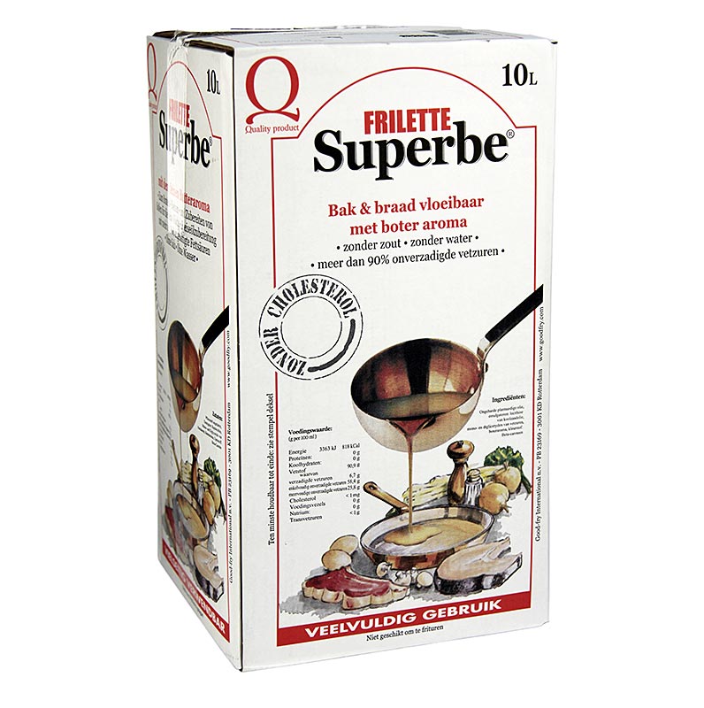 Speiseölzubereitung mit Butteraroma. Zutaten: Pflanzenöl ungehärtet, Emulgator: Rapslecithin, Mono-und Diglyceride von Fettsäuren, Butteraroma, Farbstoff: Beta-Carotin ohne technologischen Wirkung im zubereiteten Gericht. Deshalb ist bei diesem Produkt die Kennzeichnung von Zusatzstoffen auf Speisekarten (gem§9ZZulV) nicht erforderlich. Nicht zum Frittieren geeignet. Kühl und trocken lagern. Hergestellt in Deutschland. Eigenschaften: vegetarisch.