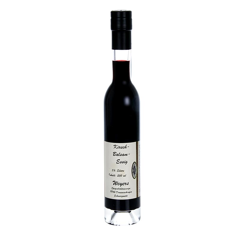Kirsch-Balsam-Essig. Zutaten: Süßkirschsaft, Sauerkirschsaft, Karamellsirup. Säuregehalt: 5% Säure. Hergestellt in Deutschland. Eigenschaften: Es müssen keine Nährwerte angegeben werden.