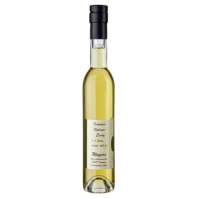 Kräuterbalsamessig. Zutaten: Weißweinessig, Kräuter, Gewürze, Karamellsirup, Antioxidationsmittel: E224 (SULFITE). Säuregehalt: 5%. Hergestellt in Deutschland. Eigenschaften: Es müssen keine Nährwerte angegeben werden.