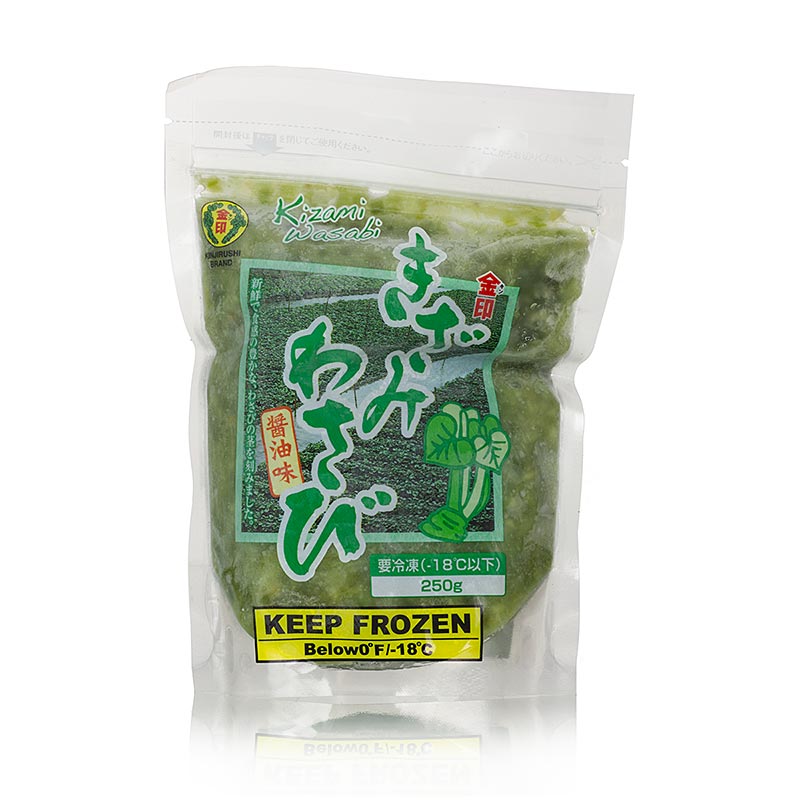 Wasabizubereitung tiefgefroren. Zutaten: Wasabi, hydrolysiertes Eiweiß, Meerrettich, SOJAsauce (Wasser, Salz, SOJABOHNEN, WEIZEN, Reis), Fermentierte Gewürze, Verdickungsmittel: E1422, E415, Wasser, Zucker, Rapsöl, Geschmacksverstärker: E621, E635, Aroma, Kelpextrakt, Farbstoff: Spirulina, E100, Emulgator: E473. Lagerung bei mindestens -18°C. Nach dem Auftauen nicht wieder einfrieren. Produkt aus Japan.
