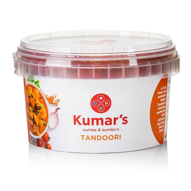 Gewürzpaste Tandoori. Zutaten: Joghurt (enthält MILCH), Gemüse (Tomaten, Knoblauch), Gewürze (Ingwer, Kreuzkümmel, Chillies, Kardamom, Kurkuma, Muskatnuß, Muskatblüte, Nelke, Zimt), Sahne (enthält MILCH), Paprikapüree (konzentriertes Paprikapüree, Zitronensaft), gebratenes Zwiebelpüree (gebratene Zwiebeln, Salz, Wasser, Sonneblumenöl, Zitronensaft, Zitronenfaser), Sonnenblumenöl, Kräuter (Korianderblatt, Minze, Bockshornklee), Salz, Zucker, Paprikaextrakt, Konservierungsstoff: Kaliumsorbat. Geöffnet begrenzt haltbar. Eigenschaften: Eiweiß aus tierischer Milch.