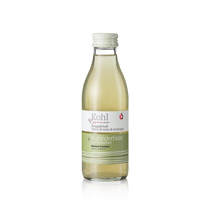 Naturreiner Bergapfelsaft mit Holunderbütenauszug. Zutaten: 99,2% Bergapfelsaft, 0,8% Holunderblütenauszug. Serviertemperatur: +8°C bis +12°C. Vor Gebrauch schütteln. Besonders empfehlenswert als Aperitif zu gegrilltem Gemüse, Nudeln mit frischen Tomaten. Hergestellt in Italien.