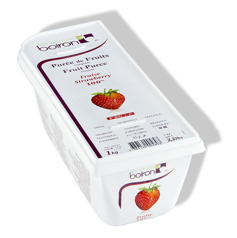 Erdbeer-Fruchtpüree, tiefgefroren. Zutaten: 100% Erdbeeren. 8°Brix +/-2°. Lagerung bei mindestens -18°C. Nach dem Auftauen im Kühlschrank bei +2°C/+4°C aufbewahren und innerhalb von 15 Tagen verbrauchen. Nach dem Auftauen nicht wieder einfrieren. Hergestellt in Frankreich.