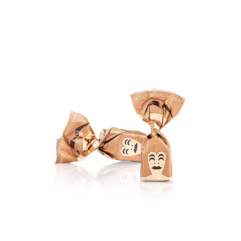 Weiße Schokoladenpralinen mit Haselnüssen. Zuaten: reine weiße Schokolade (Zucker, Kakaobutter, VOLLMILCH in Pulver, MILCHZUCKER, Emulgator: SOJALECITHIN, natürliches Vanillearoma), 35% I.G.P. HASELNÜSSE aus dem Piemont, Puderzucker, Waffel (WEIZENGRIEß, Zucker, wasserfreies MILCHFETT, LAKTOSE, MILCHPROTEINE, Salz, GERSTENMALZ, Backtriebmittel: E500ii). Kühl (4°C bis 18°C) und trocken lagern. Eigenschaften: Eiweiß aus tierischer Milch.