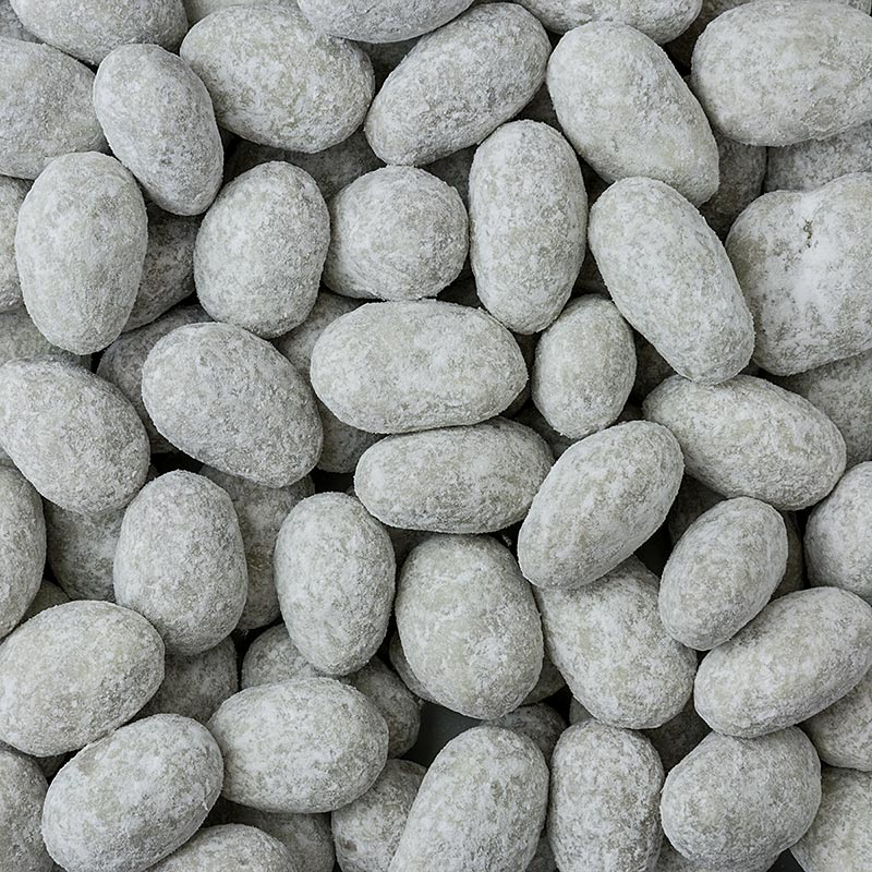 Diese Mandeln sind mit Giaduja ümhüllt und leicht mit Puderzucker bestreut.