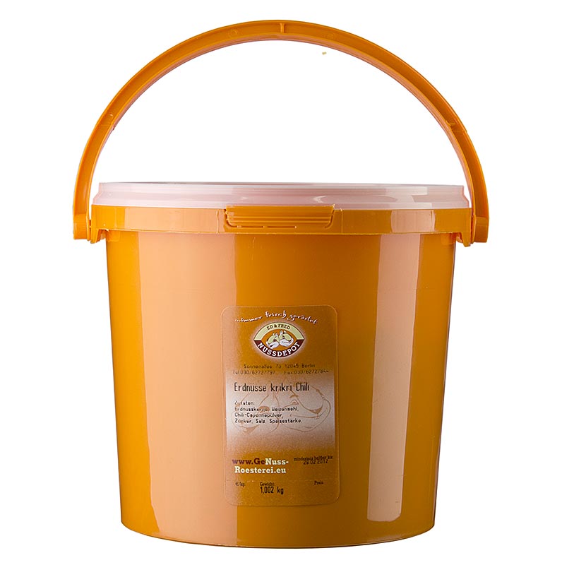 Erdnüsse mit Chilipulver. Zutaten: ERDNÜSSE, WEIZENMEHL, Zucker, Dextrose, Chili, Stärke, Salz. Trocken lagern.