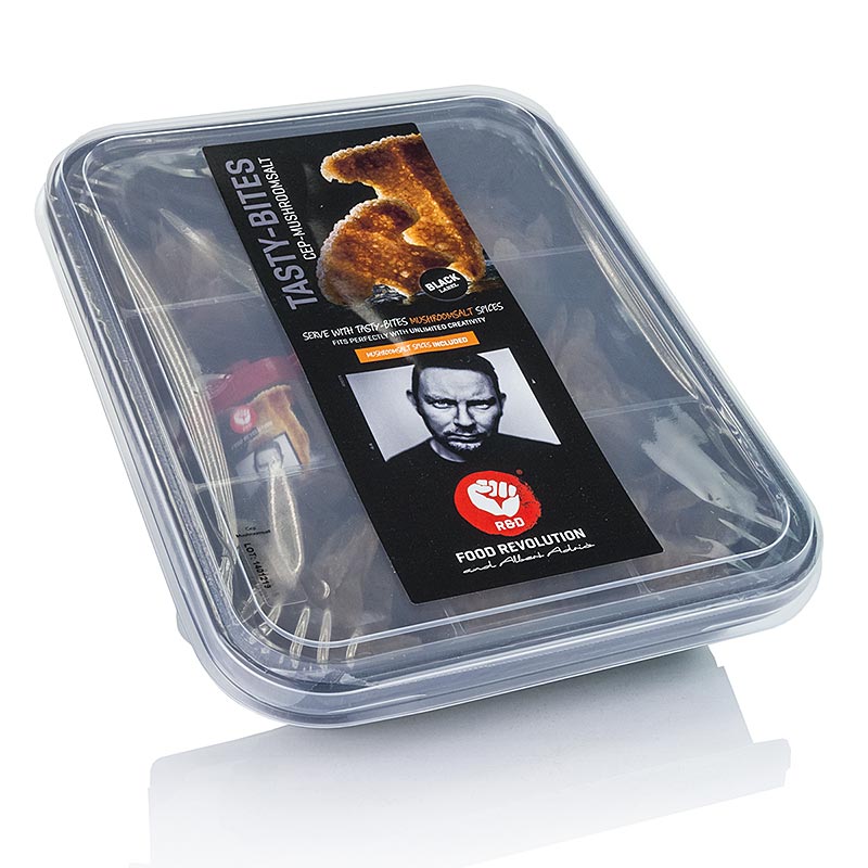 Die Tasty-Bites sind exklusive, kleine Happen als Fingerfood, Aperitif-Imbiss oder als Tellerdekoration. Köstlich, herzhaft, leicht pikant, spielerisch und originell, die Tasty-Bites werden auf Reisbasis hergestellt und sind in Kombination mit Meeresalgen, Steinpilzen oder Curry einzigartig. Nach der Zubereitung in heißem Öl werden die Tasty-Bites mit Adrias Gewürzmischung bestreut und werden so zu einem Erlebnis für Mund und Auge.