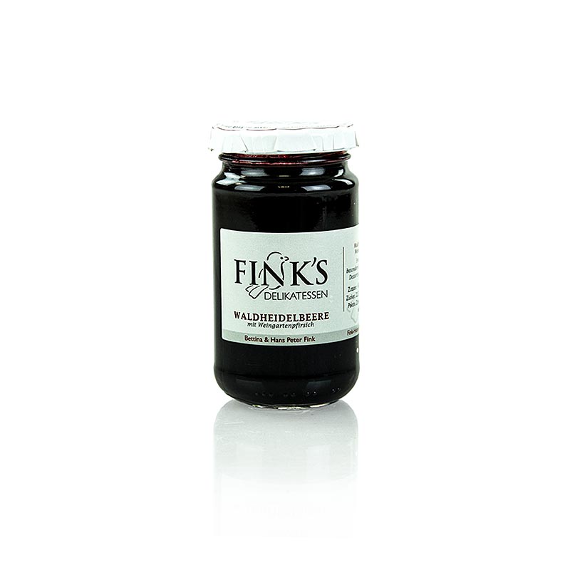 Waldheidelbeere mit Weingartenpfirsich Fruchtaufstrich. Zutaten: 45% Waldheidelbeeren, Zucker, 22,5% Pfirsich, Geliermittel: Pektin, Zitronensaft aus Zitronensaftkonzentrat. Produkt aus Östrreich.