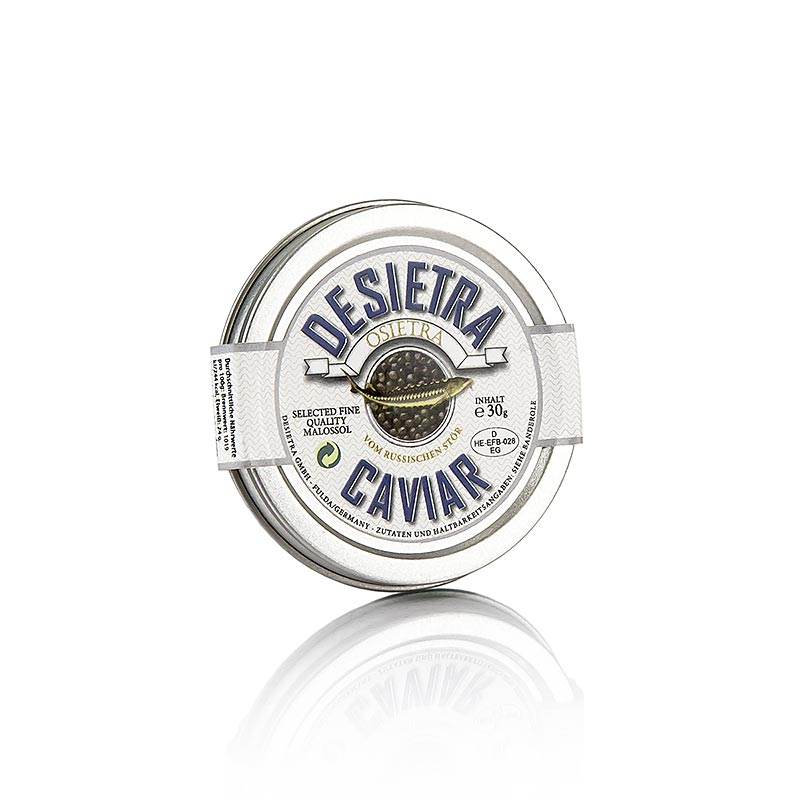 Desietra Kaviar stammt aus der Fuldaer Aquakulturanlage der Firma Desietra GmbH. Hier wird der russischen Osietra Stör (Acipenser gueldenstaedtii) ohne Einsatz von chemischen oder pharmazeutischen Zusatzstoffen und Hormonen gezüchtet. Die Kaviarproduktion erfolgt im 14-tägigen Rhythmus und ermöglicht das ganze Jahr über absolut frischen Kaviar in gleichbleibender Top-Qualität. Desietra Osietra Kaviar wird in einem schonenden Verfahren gesalzen (Malossol). Mit seinem typisch nussigen Geschmack kann er sich mit einer Top Osietra Qualität (Wildstör) durchaus messen lassen.