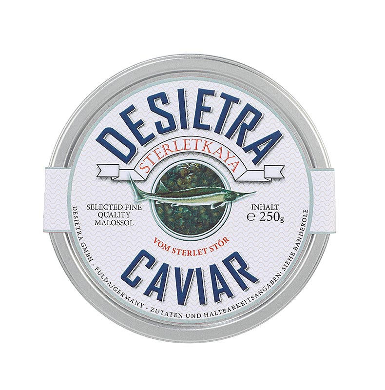Der Sterletkaya schließt das Sortiment der DESIETRA Kaviarsorten im unteren Preissegment ab. Seine Stärke liegt, wie beim Kaviar vom wilden Sevruga nicht im Aussehen, sondern er überzeugt durch seinen kräftigen und ausdrucksvollen Geschmack - eben fast wie ein wilder Sevruga-Kaviar. Desietra Kaviar stammt aus der Fuldaer Aquakulturanlage der Firma Desietra GmbH. Diese Kaviar-Qualität stammt vom Sterlet Stör, der ohne Einsatz von chemischen oder pharmazeutischen Zusatzstoffen und Hormonen gezüchtet wird. Die Kaviarproduktion erfolgt im 14-tägigen Rhythmus und ermöglicht das ganze Jahr über absolut frischen Kaviar in gleichbleibender Top-Qualität. Desietra Kaviar wird in einem schonenden Verfahren gesalzen (Malossol).