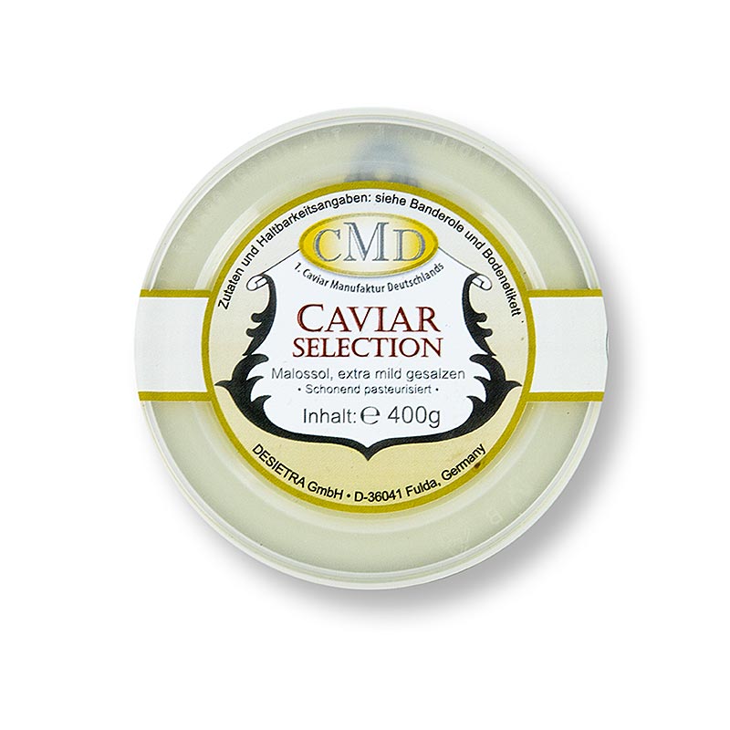 Caviar Malossol, extra mild gesalzen, schonend pasteurisiert. Zutaten: STÖRROGEN (Acipenser spp.), Speisesalz, Konservierungsstoff: E285. Ungeöffnet bei konstant kühler Lagerung von +2°C bis +7°C lagern. Aus Aquakultur Deutschland. DE HE-EFB-028 EG. Eigenschaften: pasteurisiert.