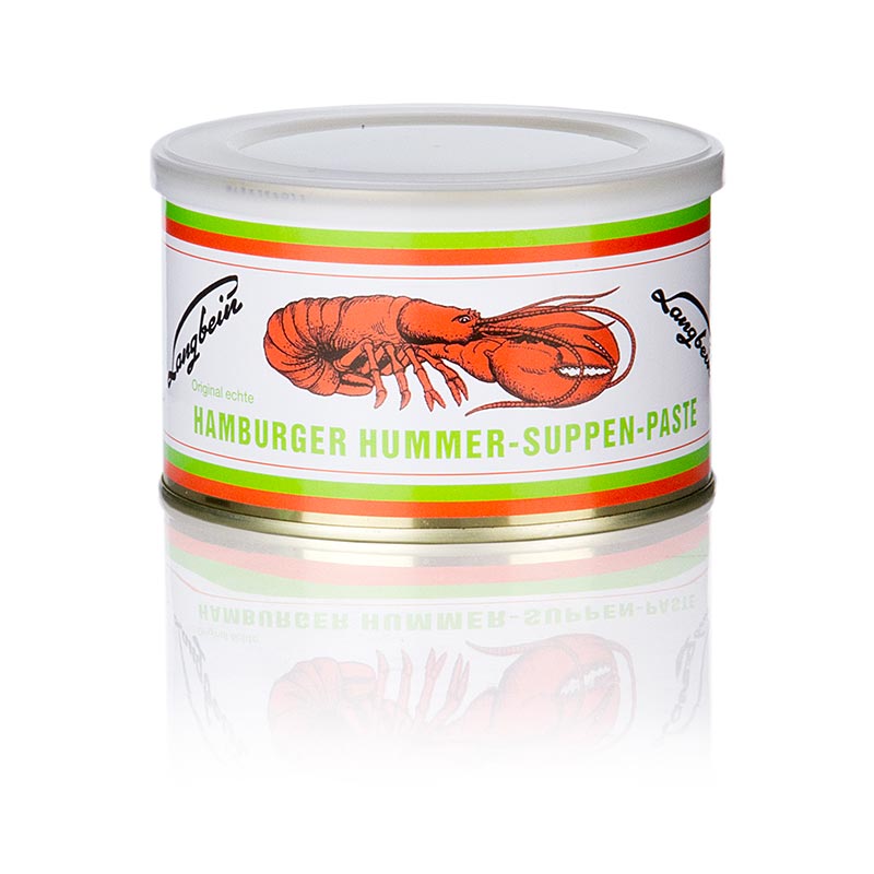 Küchenfertige Paste zur Herstellung einer Hummersuppe. Zutaten: Pflanzenfett, WEIZENMEHL, KRUSTENTIERAUSZÜGE, Salz, natürliche Aromastoffe, Farbstoff: Paprikaextrakt. Zubereitung: Für einen Teller Hummersuppe 25g dieser Paste mit 1/4 Liter Wasser oder Fleischbrühe ansetzten, glatt verrühren und aufkochen lassen. Nach Geschmack würzen und mit Sahne oder Cognac die Suppe verfeinern. Als Einlage z.B. Hummer- oder Krebsfleisch.