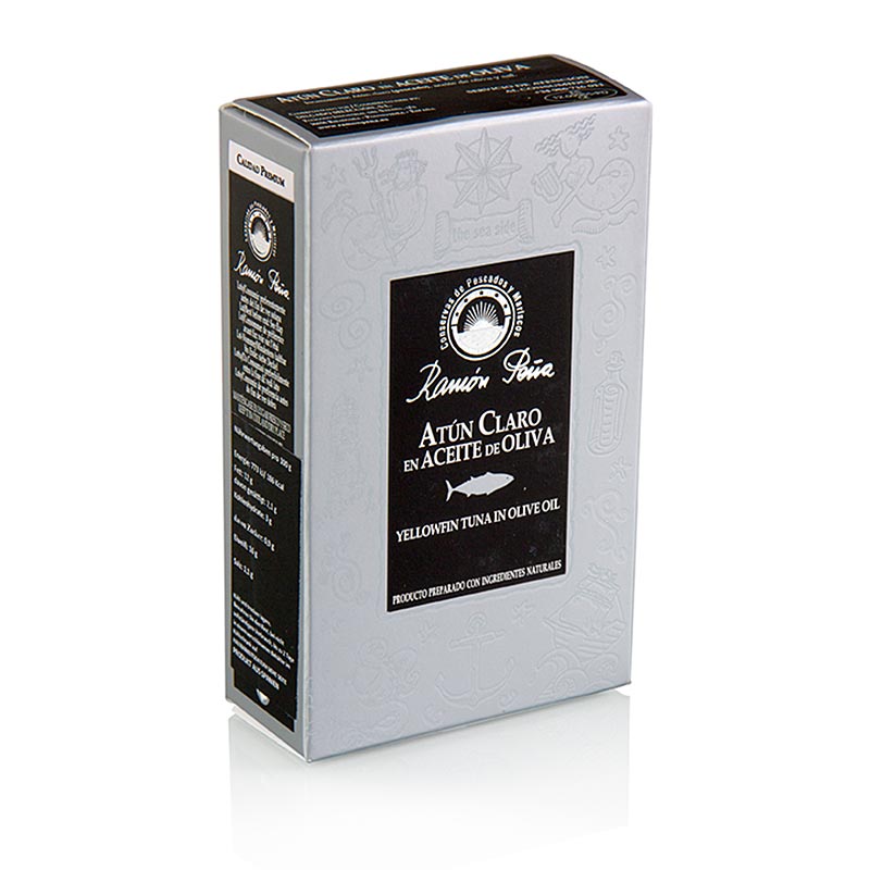 Gelbflossenthunfisch in Olivenöl. Zutaten: GELBFLOSSENTHUNFISCH, OLivenöl, Salz. Kühl und trocken lagern. Nach dem Öffnen gekühlt im verschlossenen Behälter 2 Tage haltbar. Hergestellt in Spanien.