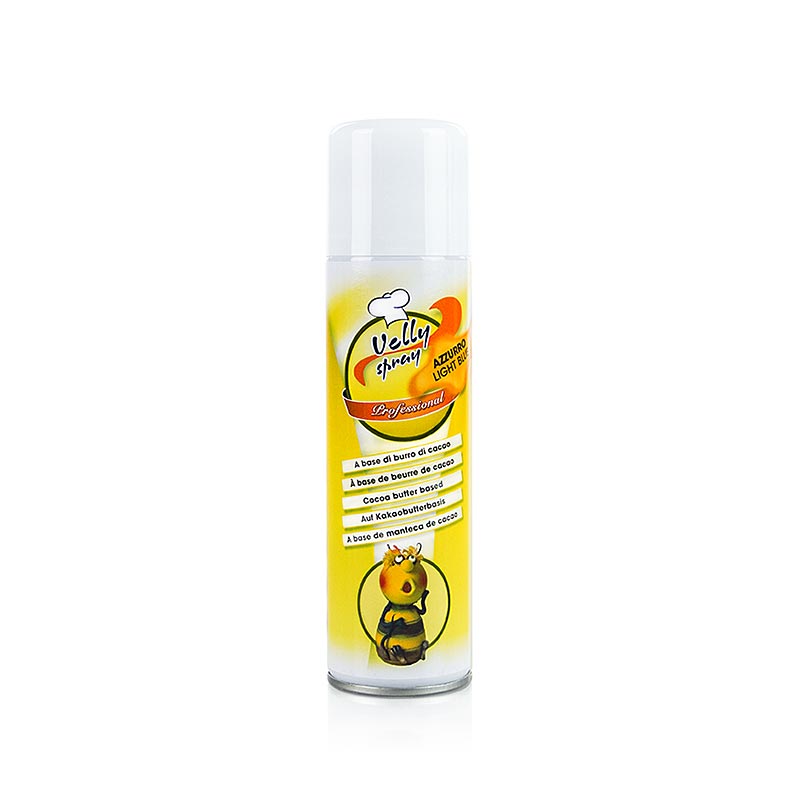 Lebensmittelfarbspray auf Kakaobutterbasis mit samtigen Effekt zur Anwendung auf Halbgefrorenem und Eis. Zutaten: Treibgas (Butan E943a, Isobutan E943b, Propan E944), Kakaobutter, Farben: E171, E133. Anwendung: Dose vor Gebrauch mindestens 2 Stunden bei +25°C lagern. Vor Gebrauch schütteln. Dünn und gleichmäßig im Abstand von 25/30 cm aufsprühen. Übertriebene Benutzung vermeiden. Die empfohlene Wartezeit vor dem Verzehr sind 4 Stunden. Gefahr ! Enthält extrem entzündbares Aerosol. Behälter steht unter Druck: Kann bei Erwärmung bersten. Darf nicht in die Hände von Kindern gelangen. Von Hitze, heißen Oberflächen, Funken, offenen Flammen sowie anderen Zündquellenarten fernhalten. Nicht rauchen. Nicht gegen offene Flamme oder andere Zündquelle sprühen. Nicht durchstechen oder verbrennen. Auch nicht nach Gebrauch.Vor Sonneneinstrahlung schützen und nicht Temperaturen von mehr als 50°C aussetzen. Nur für professionelle Anwender. Eigenschaften: Extrem Entzündlich, Es müssen keine Nährwerte angegeben werden.