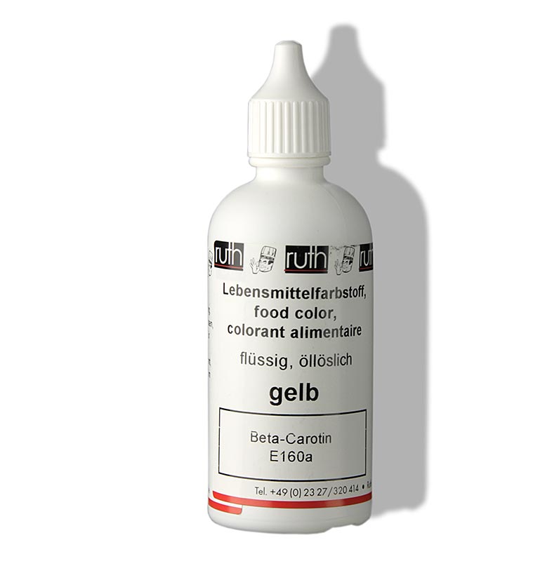 Lebensmittelfarbstoff flüssig, fettlöslich. Zutaten: Beta-Carotin E160a. Für Lebensmittel begrenzte Verwendung, nicht für den Verkauf im Einzelhandel. Dunkel, gut verschlossen unter +20°C lagern. Produkt aus Deutschland. Eigenschaften: Es müssen keine Nährwerte angegeben werden.