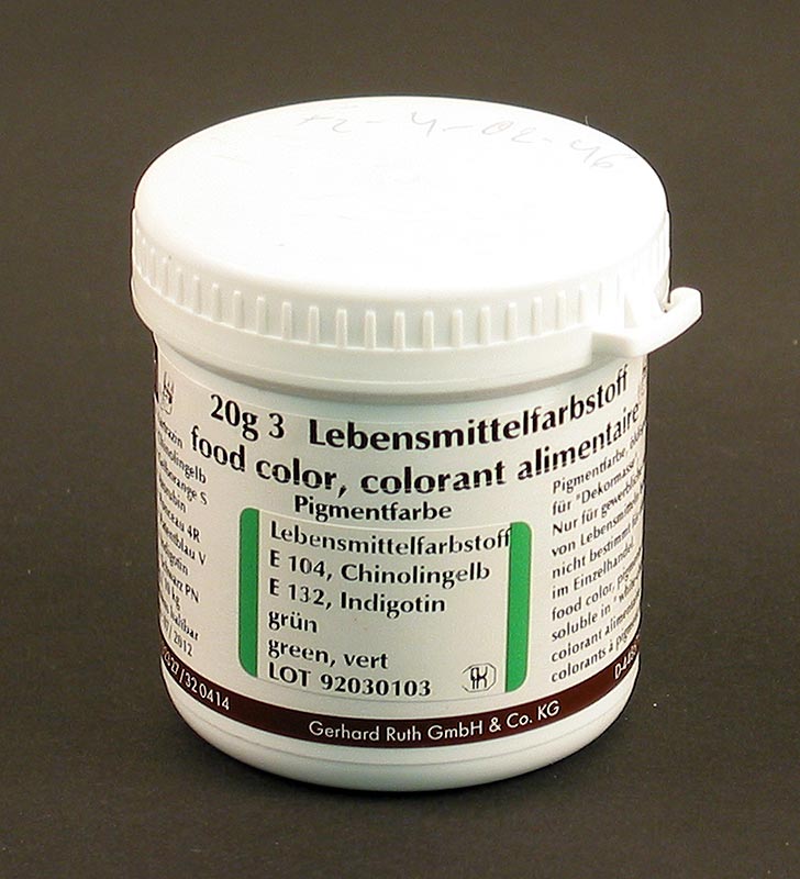 Farbstoffpulver für Lebensmittel, fettlöslich. Zutaten: Tartrazin E102*, Brillantblau FCF E133. Farbstoffgemisch: 21,8%. Al-verlackt (enthält 25,6% Aluminium). *E102 kann die Aktivität und Aufmerksamkeit bei Kindern beeinträchtigen. Deklaration und Höchstmenge gemäß VO (EG) 1333/ 2008. Zum Färben von Lebensmitteln (beschränkte Verwendung). Zur Färbung von Oberflächen von Süßwaren geeignet zum Färben von kakaobutterhaltigen Zuckerwarenmasse ("weiße Schokolade"). Kühl und trocken lagern. Produkt aus Deutschland. Eigenschaften: Azofarbstoffe, Es müssen keine Nährwerte angegeben werden.