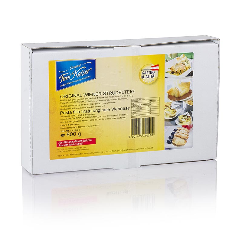 Blätter aus gezogenem Strudelteig, tiefgekühlt. Zutaten: WEIZENMEHL, Wasser, Glukosesirup, Sonnenblumenöl, Stärke, jodiertes Speisesalz (Natriumchlorid, Kaliumiodid). Teig auftauen lassen (bei Zimmertemperatur oder im Auftaumodus der Mikrowelle), dann aus der Folie nehmen und nach Belieben verarbeiten. Lagerung bei mindestens -18°C. Nach dem Auftauen nicht wieder einfrieren und zügig verbrauchen.