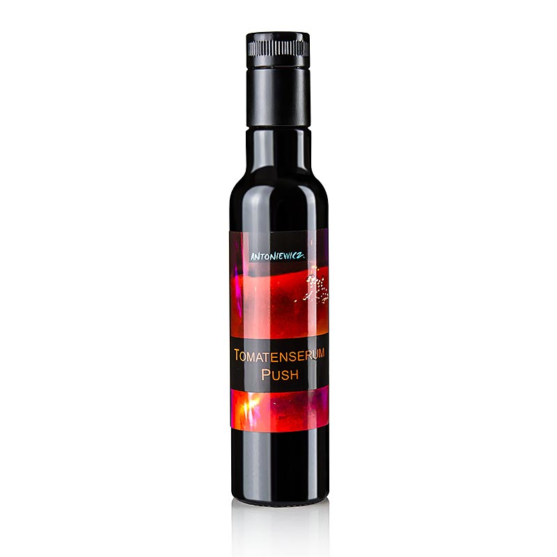 Völlig neuartig ist dieses Tomatenserum, das als Konzentrat aus "auf den Punkt" gereiften und schonend reduzierten Tomaten hergestellt wird. Hierbei werden die in den Tomaten enthaltenen natürlichen Glutaminsäuren hoch konzentriert. Das Tomatenserum "Push" potenziert mit frisch-säuerlicher und intensiver Tomatennote den Eigengeschmack der Grundprodukte und rundet Gerichte ab. Stundenlanges Reduzieren von Tomatensugo entfällt somit. Dosierung: wenige Tropfen reichen aus (0,4 - 1,2%), z.B. zum Abrunden von 1 Liter Brühe genügt 1 TL Tomatenserum. Anwendungen: Perfekt zu Pasta, dunklen und hellen Saucen, Salat, Gemüse und Suppen - gebunden oder klar.