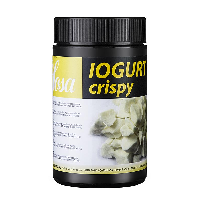 Gefriergetrocknete Joghurt Crispys. Die Firma Sosa ist in Spanien seit mehreren Generationen für ihre qualitativ hochwertigen Hilfsmittel für die Patisserie bekannt. In ihrem Sortiment findet man ausgezeichnete Nussmarks, gefriergetrocknete Früchte und Fruchtpulver, Aromaessenzöle, pulverisierte Milchprodukte, Grundmassen für Eis- und Sorbets, aber auch Texturgeber für die Molekularküche. Sosa-Produkte werden in fast allen Top-Restaurants und -Patisserien in Spanien verwendet und die Firma unterstützt und fördert die renommierte Patisserie- Schule EspaiSucre in Barcelona.