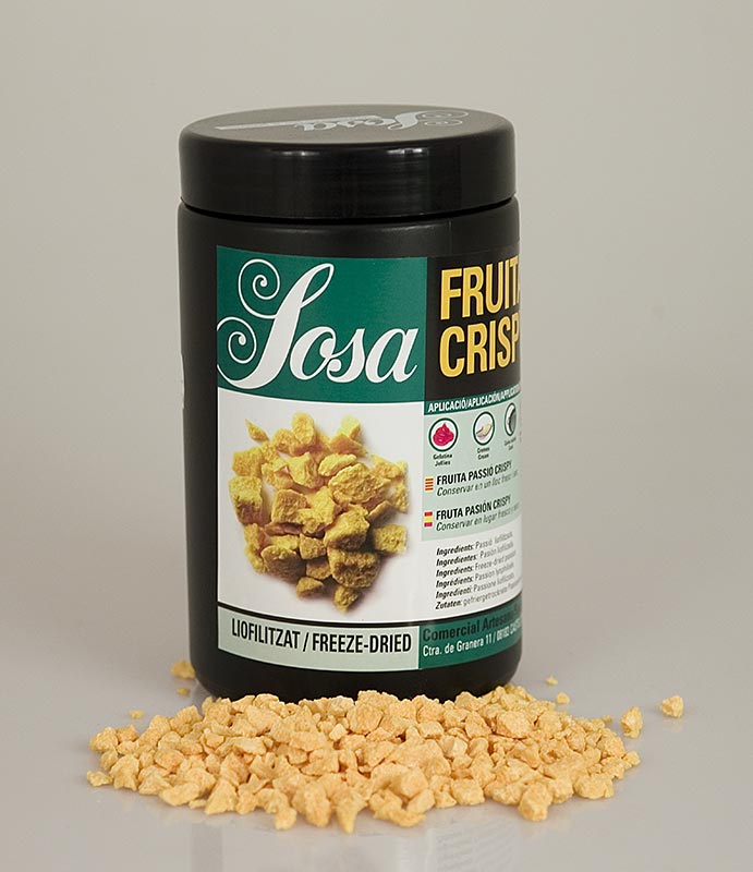 Durch die Gefriertechnologie wird das süß-exotische Passionsfrucht-Aroma in den getrockneten Fruchtstücken perfekt konserviert und erhält einen attraktiven Crispy-Effekt. Die Firma Sosa ist in Spanien seit mehreren Generationen für ihre qualitativ hochwertigen Hilfsmittel für die Patisserie bekannt. In ihrem Sortiment findet man ausgezeichnete Nussmarks, gefriergetrocknete Früchte und Fruchtpulver, Aromaessenzöle, pulverisierte Milchprodukte, Grundmassen für Eis- und Sorbets, aber auch Texturgeber für die Molekularküche. Sosa-Produkte werden in fast allen Top-Restaurants und -Patisserien in Spanien verwendet und die Firma unterstützt und fördert die renommierte Patisserie-Schule EspaiSucre in Barcelona.
