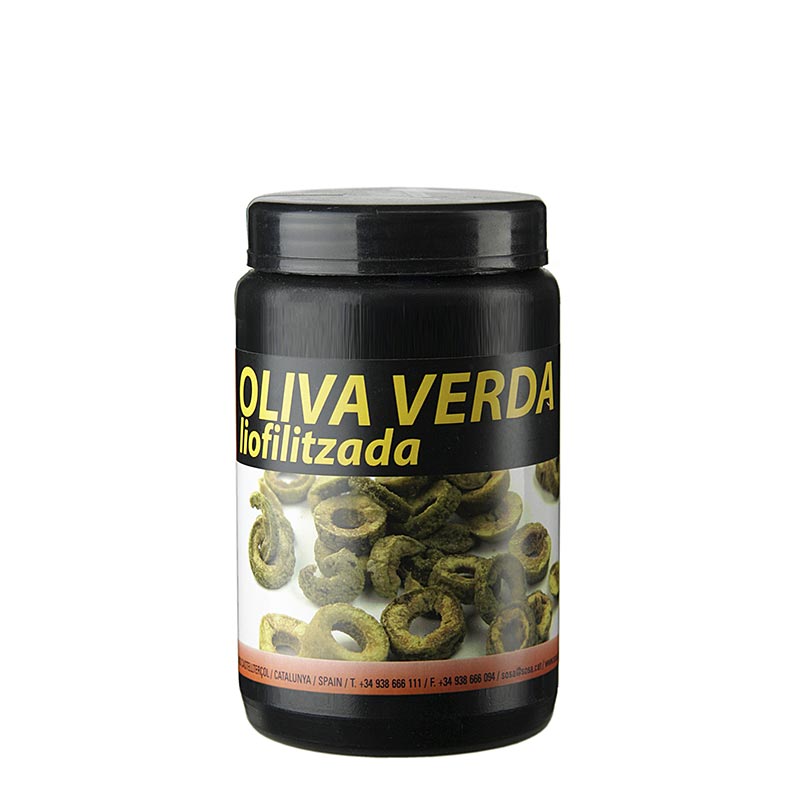 Grüne Olivenscheiben, gefriergetrocknet. Zutaten: grüne Oliven, Salz. Kühl und trocken lagern. Eigenschaften: Es müssen keine Nährwerte angegeben werden.