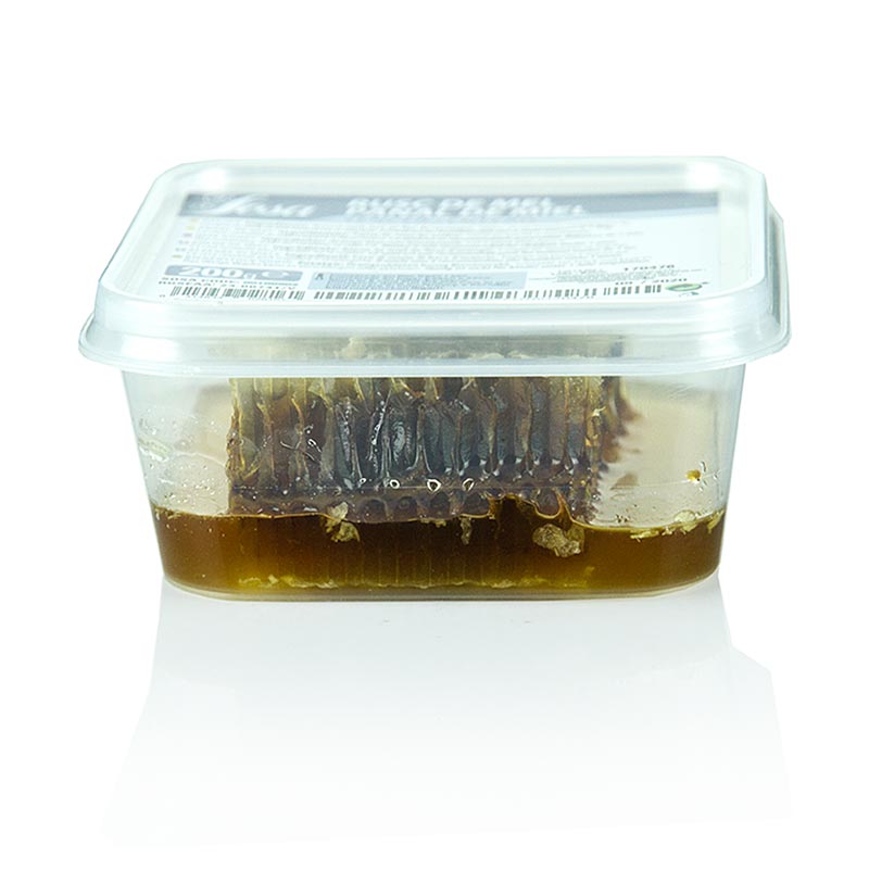 100% Honig in Akazien Honigwabe (Robinia pseudoacacia sp >20%). Zutaten: Wabe mit Orangenblüten-Honig. Schneiden Sie ein kleines Stück heraus und kauen Sie es. Das restliche Wachs kann geschluckt oder ausgestoßen werden. Nicht für Kinder unter 12 Monaten geeignet! Kühl und trocken lagern. Ursprung: Spanien. Eigenschaften: Es müssen keine Nährwerte angegeben werden. Nährwerttabelle