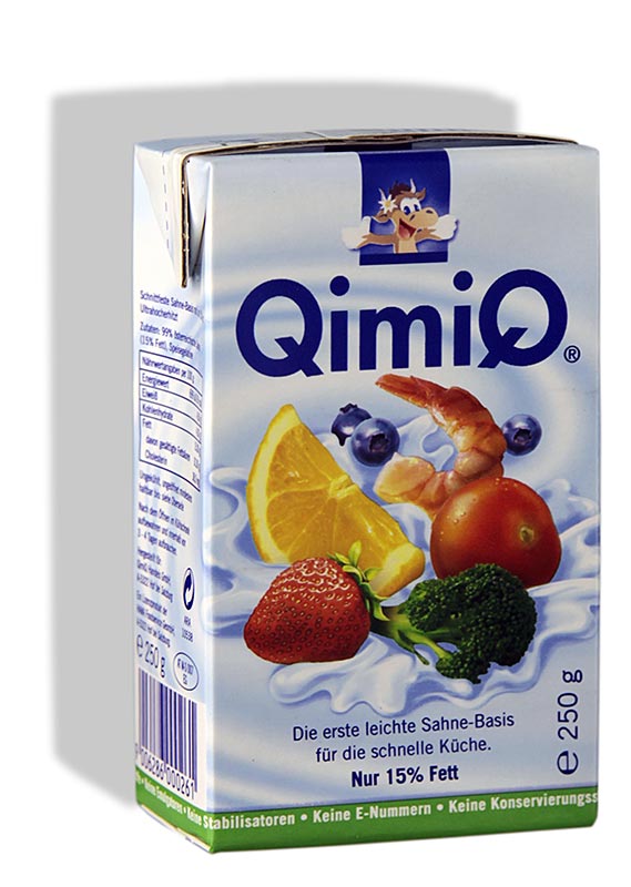 Sahnezubereitung (15% Fett) mit Gelatine UHT. Zutaten: 99% österreichische SAHNE (15% Fett), Rindergelatine. Nach dem Öffnen im Kühlschrank aufbewahren und innerhalb von 3 - 4 Tagen aufbrauchen. Zubereitung: Ungekühltes Qimiq Classic mit dem Schneebesen oder dem Mixer glatt rühren. Dann Zutaten laut Rezept zugeben. Produkt aus Österreich. Eigenschaften: Eiweiß aus tierischer Milch, UHT Ultrahocherhitzt.
