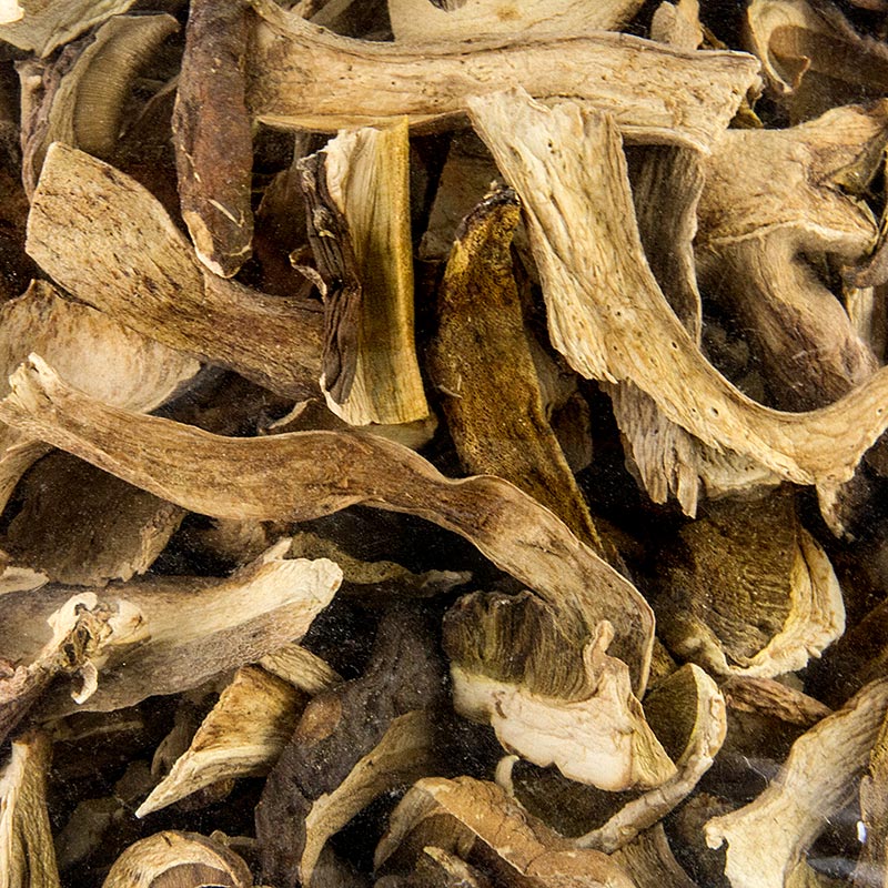 Dieser in fast ganz Europa beheimatete Edelpilz wächst bei uns von Mai bis September, hauptsächlich in lichten Buchenwäldern. Der getrocknete Steinpilz eignet sich hervorragend für Pilzgerichte sowie zum Verfeinern von Suppen und Saucen. Die in Stücke geschnittenen Steinpilze sind getrocknet und werden vor dem Verarbeiten eingeweicht. Probieren Sie als Einweichflüssigkeit statt Wasser, je nach Rezeptur, auch mal Milch oder Sherry.