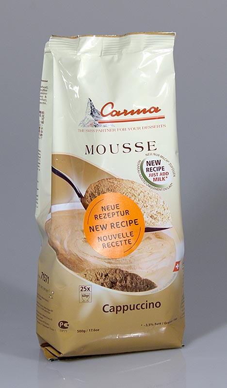 Easy to Use-Pulver für die einfache Herstellung von Cappuccino Mousse.Mit kaltem Wasser aufschlagen und geschlagene Sahne unterziehen - kaltstellen. Carma Mousse ist abstechbar, gefrierfest und auftaustabil. Ein leckeres Dessert für alle Gelegenheiten!!!!