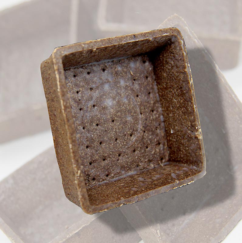 Mürbeteig-Gebäckform zum Füllen mit Schokoladenpulver. Zutaten: WEIZENMEHL, Zucker, BUTTER, Palmfett ungehärtet, 5% Schokoladenpulver (Kakao, Zucker, Kakaobutter), Kakaopulver fettarm, Emulgator: SOJALECITHIN, MOLKEPULVER, Kochsalz, natürliches Aroma. Kühl und trocken lagern. Eigenschaften: Eiweiß aus tierischer Milch.