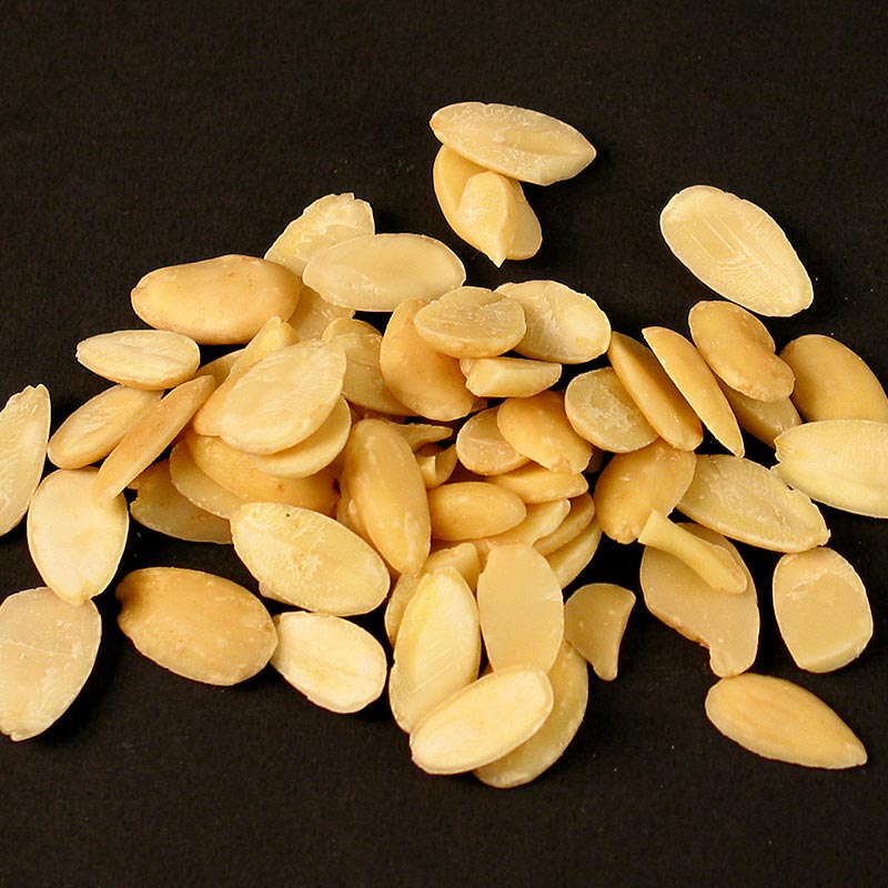 Mandelns blanchiert und halbiert. Zutaten: MANDELN. Kühl (+5°C bis +12°C), trocken und geruchsfrei lagern.