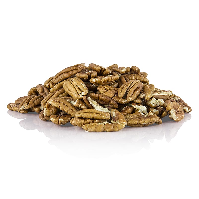 Der in Nordamerika und Asien beheimatete Hickorybaum trägt die Pekannussfrüchte. Die Form der Kerne deutet auf die Verwandschaft mit der Walnuss hin. Die Pekannuss ist jedoch länglicher, fester in der Konsistenz und wesentlich süßer im Geschmack. Sie hat die gleiche vierteilige Grundform, ihre weich gezüchtete Schale läßt sich jedoch viel leichter knacken. Pekannüsse sind besonders beliebt zum Backen und Kuchen, Keksen und Plätzchen. Ein großer Teil der Ernte kommt jedoch geröstet und gesalzen auf den Markt. Ebenso dienen sie als Speiseöllieferant und es wird Nussmehl daraus hergestellt. Im Kühlschrank lagern oder einfrieren.