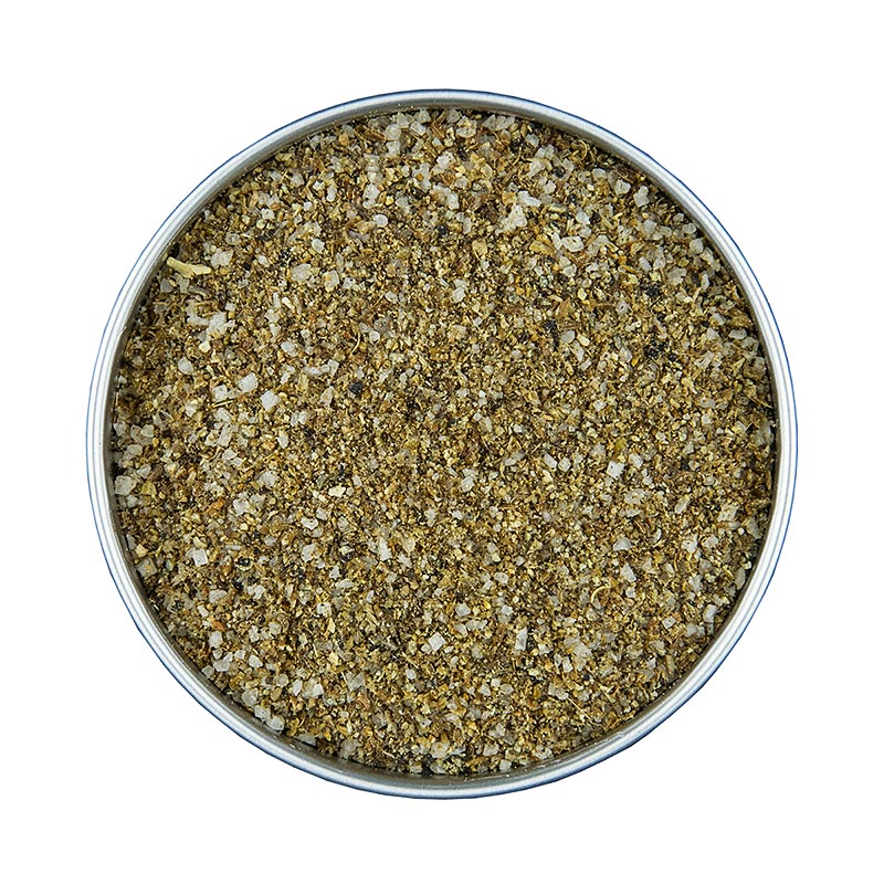 Gewürzsalz. Zutaten: Luisenhaller Salz, Kümmel, Salish Alderwood (geräuchertes Meersalz), Pfeffer schwarz, Kreuzkümmel, Koriander, Nigella, Muskat, Zitronenschale, Knoblauch. Eigenschaften: Es müssen keine Nährwerte angegeben werden.
