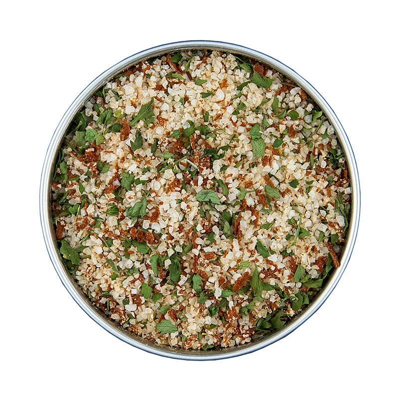 Gewürzsalz Bouillabaisse. Zutaten: Luisenhaller Tiefensalz, Tomatenflocken, Paprika rosenscharf, Knoblauch, Petersilie, Sternanis, Fenchelsaat, Safran, Thymian. Auf junges Gemüse, auf gedämpften, zart gebratenen oder pochierten Fisch ohne Haut streuen. Da wir unsere Gewürzsalze ohne Trennmittel und andere Zusätze herstellen, ist ein leichtes Verklumpen möglich. Bitte deshalb vor jedem Gebrauch schütteln. Eigenschaften: Es müssen keine Nährwerte angegeben werden.