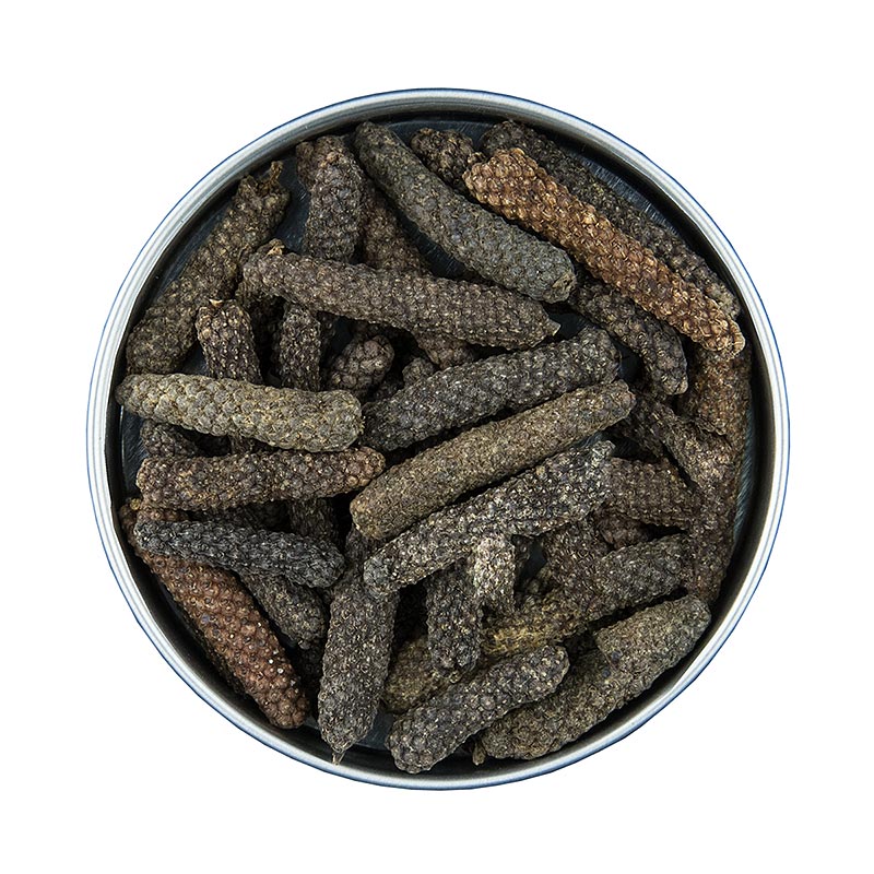 Der lange Pfeffer (piper longum) ist auch unter dem Namen Jaborandi-Pfeffer bekannt. Er duftet süßlich und schmeckt anfangs wie schwarzer Pfeffer, hinterlässt aber einen rauchigen, kräftigen Nachgeschmack. Er ist der am längsten in Europa bekannte Pfeffer. Eine ausführliche Beschreibung des Gewürzes und das Rezept "Tranche vom Räucherlachs" finden Sie im Buch von Ingo Holland "Meine Gewürze". Verwendung: In seiner Heimat (Indien und Indonesien) wird der lange Pfeffer in gedünsteten Gerichten und Pickles ungebrochen verwendet. Grob gestoßen ist er ein passendes Aroma für Wild, Lamm oder geräucherten Fisch. Lassen Sie die ganzen Pfefferfrüchte auch mal in Sauce oder Eintopf ziehen. Langer Pfeffer, ganz. Zutaten: Langer Pfeffer. Eigenschaften: Es müssen keine Nährwerte angegeben werden. Verantwortlicher Unternehmer: Altes Gewürzamt GmbH Ingo Holland, Unterlandstr. 50, 63911 Klingenberg, Deutschland.