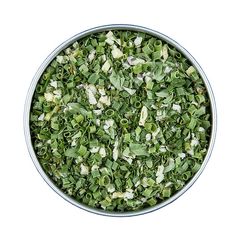 Gewürzmischung. Zutaten: Schnittlauch, Zwiebeln rot, Dillspitzen, Liebstöckel, Knoblauch, Petersilie, Kerbel, Bärlauch, Cherry Peppers Chili, Estragon. Bitte vor Gebrauch neu mischen. Eigenschaften: Es müssen keine Nährwerte angegeben werden.