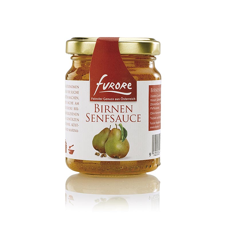 Birnensenfsoße. Zutaten: Zucker, Glukosesirup, 22% Birnen, Wasser, Geliermittel: Pektin, Säuerungsmittel: Citronensäure, Pfeffer, Chili, Aroma, SENFÖL, natürliches Pfefferaroma. Vor dem Öffnen trocken und vor Wärme geschützt lagern. Nach dem Öffnen im Kühlschrank aufbewahren und innerhalb von 2 Monaten aufbrauchen. Hergestellt in Österreich.
