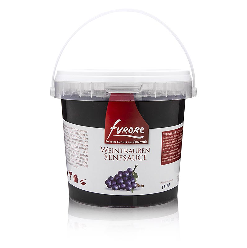 Weintrauben Senfsauce. Zutaten: Zucker, Glukosesirup, 28% Weintrauben rot kernlos, 4% schwarze Johannisbeeren, Verdickungsmittel: Pektin, Säuerungsmittel: Zitronensäure, Holunderbeerenextrakt, Senfaroma, Chili, Pfefferaroma. Ohne Konservierungsstoffe. Trocken und lichtgeschützt lagern. Produkt aus Österreich.