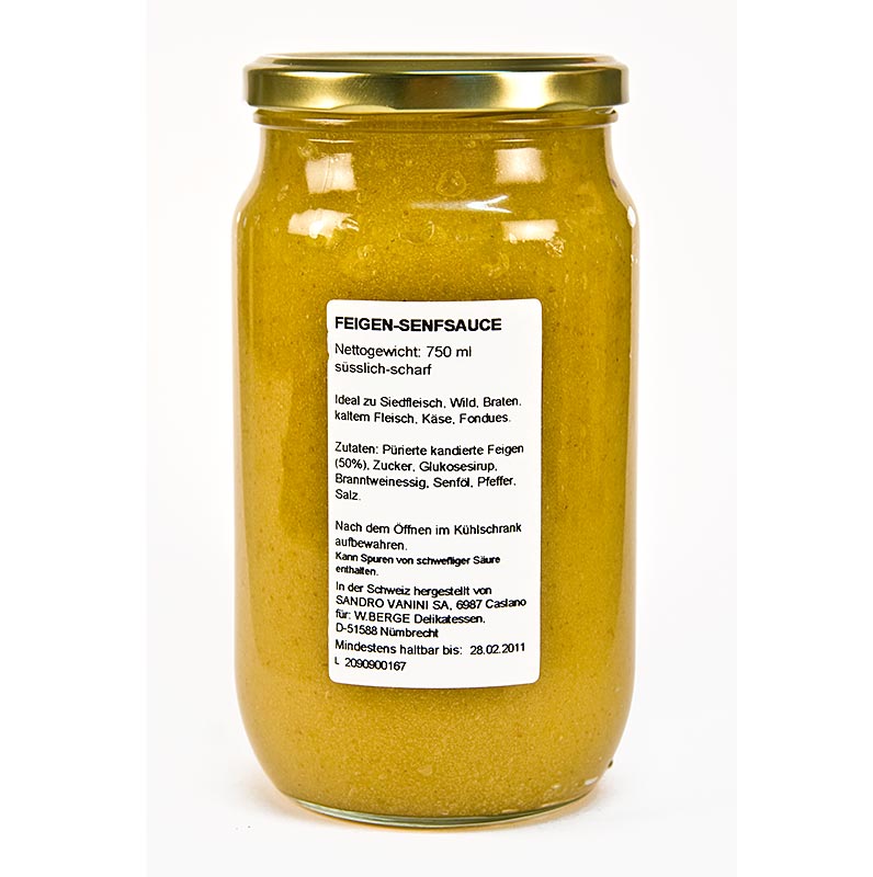 Feigen-Senf-Sauce. Zutaten: 50% pürierte kandierte Feigen (50% Feigen, Zucker, Glukosesirup), Zucker, Wasser, Glukosesirup, Geliermittel: Pektin, Branntweinessig, SENFÖL, Pfeffer, Salz. Vor dem Verzehr gut umrühren. Nach dem Öffnen im Kühlschrank aufbewahren. Hergestellt in der Schweiz.