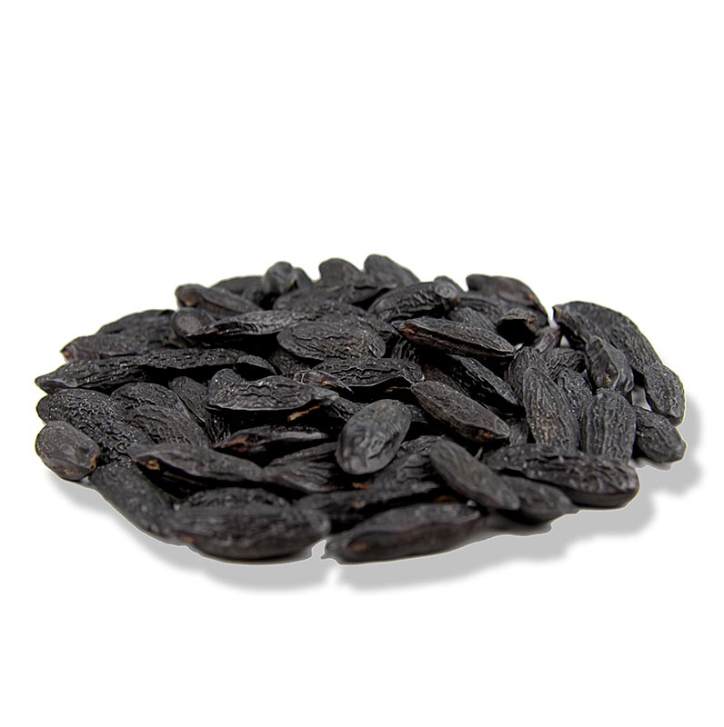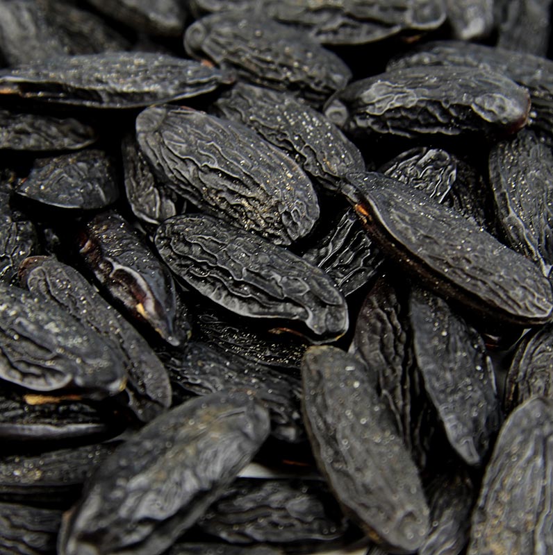Tonkabohnen sind die Samen des Tonkabaumes. Der zur Familie der Schmetterlingsblütengewächse zählende Baum ist ursprünglich im nördlichen Südamerika beheimatet. Heute stammen dessen fermentierte Samen meist aus Venezuela und Nigeria. Tonkabohnen können ähnlich wie Vanille für die Aromatisierung von Eis, Pudding oder Soufflés verwendet werden. Pro Liter Süßspeise reichen einige wenige Bohnen. Ihr Geruch ist süß und stark aromatisch. Geschmacklich sind sie leicht bitter. Ein Hauch des Tonkabohnenaromas reicht vollkommen aus, um süße und herzhafte Speisen das exotische Etwas zu verleihen.